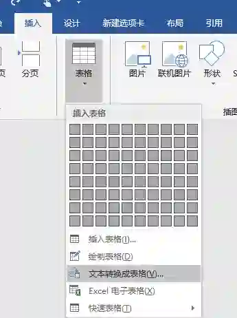 单击“插入”选项卡,单击“表格”下三角,选择“文本转换成表格”命令;