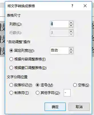 (3)在“自动调整”区根据需要选择,以设置表格列宽,“文字分隔位置”自动选中文本中使用的分隔符;