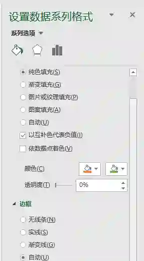 在图表区中选中数据列,然后右键设置“数据系列格式”-“填充”-“纯色填充”,并同时勾选”以互补色代表负值“,这时填充颜色选项中会出现两个备选颜色 ,分别选择合适的颜色表示正负值;