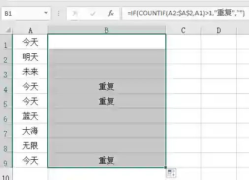 打开文档,,在B2单元格里输入公式“=IF(COUNTIF(A$2:$A3,A2)>1,"重复","")”(不含引号);