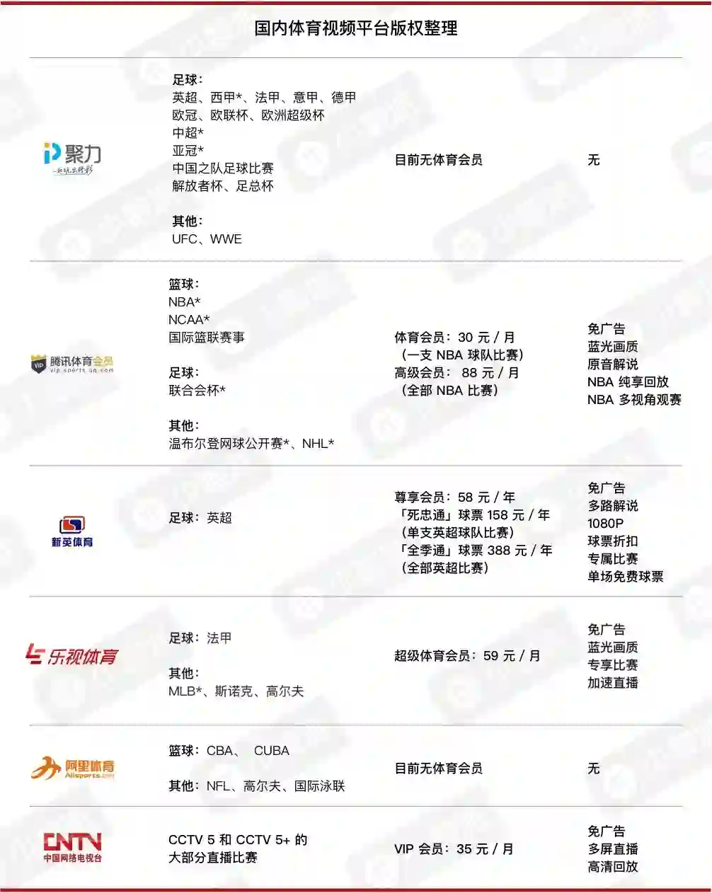 大多数平台都会提供一些免费比赛(比如腾讯视频的 NBA 转播,PPTV 的西甲转播等),其中会涵盖部分重要场次,购买体育会员的目的更多的是为了观看一些会员专享比赛,以及享受免广告和高画质等权益;
