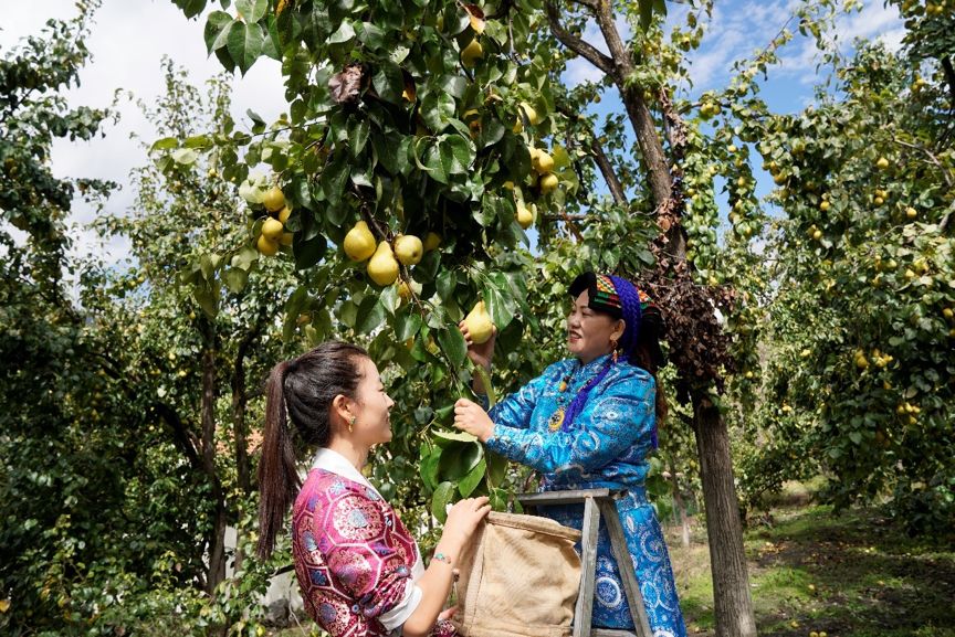 黄澄澄的梨散落一地——是鸡腿形状,有两拳头大小,看上去香甜饱腹,当地人称为“鸡腿梨”。