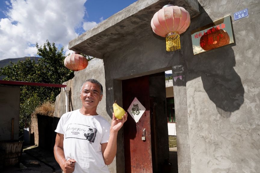 图:种植户刘兴贵举着金川雪梨在家门口留影,通过“雪梨经济”,他已经成为当地残疾人创业基金示范户