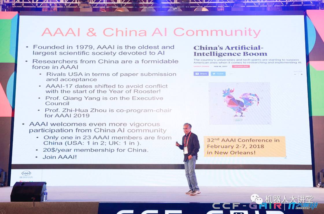 就像刚才大家提到的,我也是AAAI的主席,首先我向大家简单介绍一下AAAI,AAAI主要是关注于人工智能的研发机构,它同时也是人工智能界最为久远的一个科学研究机构,它是在1979年建立的,它现在拥有大量的成员机构,同时AAAI也举办了目前全顶尖的人工智能论坛和相关的活动。我特别要提到的是,中国已经成为了AAAI非常重要的一员,有来自中国的很多的学者,特别是在中国加入之后,目前在我们整体的AAAI论文的提交数量,以及包括我们的科研提交量上,我们的文章的接受量已经远远超过了美国,而在去年AAAI会议计划在中国昆明举办,因为是春节期间,我们看到很多中国的开发者没有参加。徐扬生教授也是AAAI2019年执委会主席。