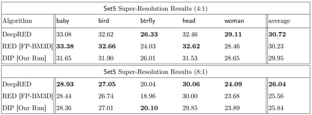 研究人员分别测试了 4 和 8 的比例因子,并将结果与 DIP [13] 和 RED [17] 在两个数据集上进行了比较。表 2 和表 3 对结果进行了总结。可以看出,RED+DIP 的效果始终优于单独使用 DIP 或 RED。