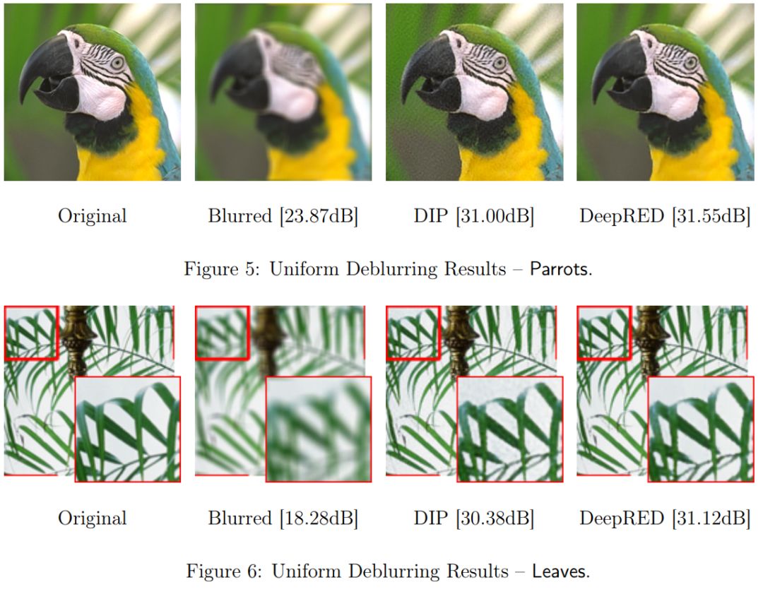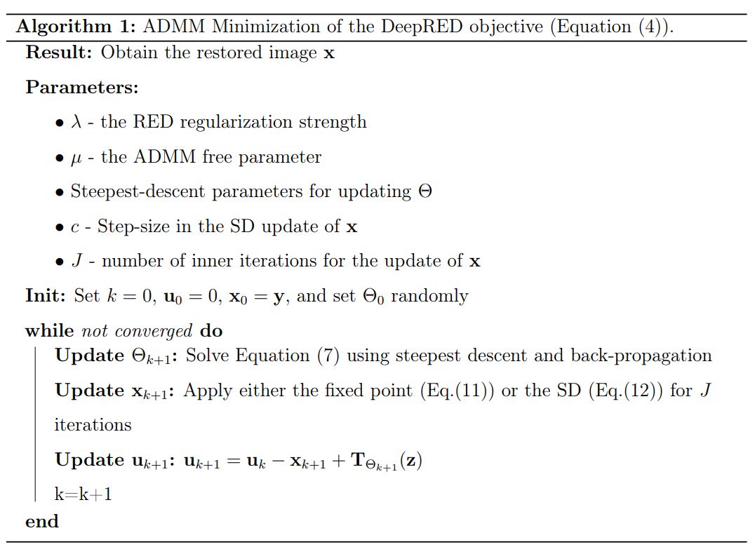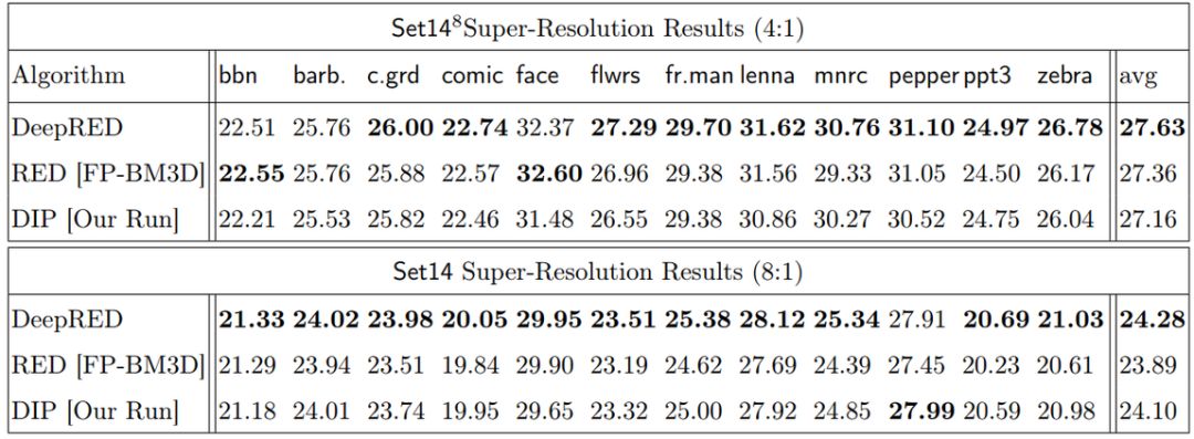 这些都是通过使用交替方向乘子法 (ADMM)[18] 实现的,它有一个额外的优势:相对于所采用的停止规则,它有一个稳定的恢复。这个方案被称为 DeepRED,经过图像去噪、单张图像超分辨率和图像去模糊方面的测试,RED 显示出明显优势。结果表明,无论是相对于 [17] 中的自然 RED 或 DIP 本身,所有结果都得到了显著改善。事实上,尽管 DeepRED 是一种无监督的方法,但它更接近于逆问题的监督求解器。