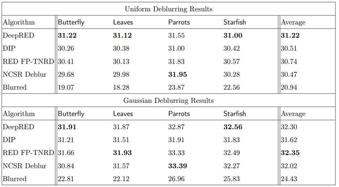 研究人员将 DeepRED 与 DIP、RED 和 NCSR Deblur 在 4 幅彩色图像上进行了比较。结果如表 5 所示。此外,图 4、图 5 和图 6 给出了该实验的三组结果,结果表明 RED 正则化效果优势明显。