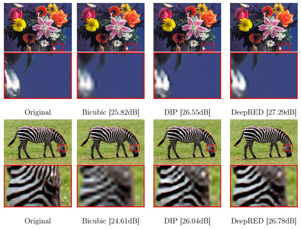 此前,深度图像先验(DIP)被证明可以在不用学习的情况下解决图像去噪、去水印、超分辨率问题。但这一方法与最先进的替代方法相比,效果并不理想。本文基于 DIP 和去噪正则化(RED)概念,提出了 DeepRED 方法。它将两者结合,获得了非常有效的结果。