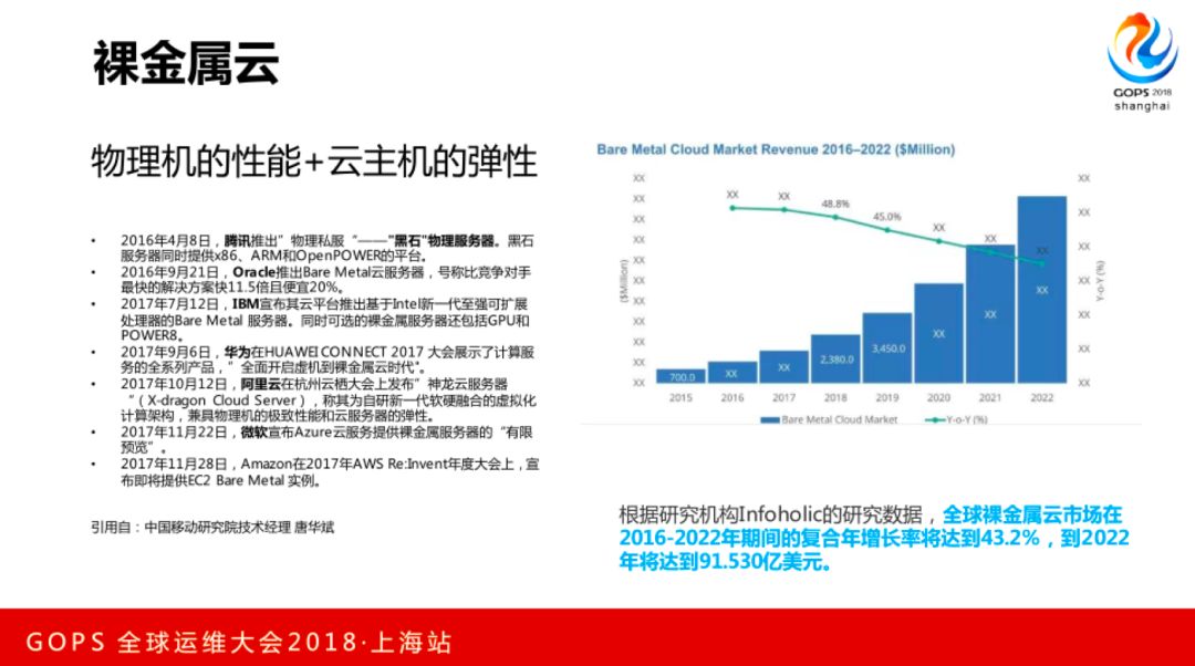 首先是裸金属,裸金属云也喊了很长时间了,这有一份数据,来自于中国移动研究院,腾讯云推出“黑石”物理服务器,还有Oracle、IBM、华为、阿里云、微软都有裸金属服务器。这是一个趋势,裸金属云发展还是比较快的,到2020年有90亿美金的市场份额。