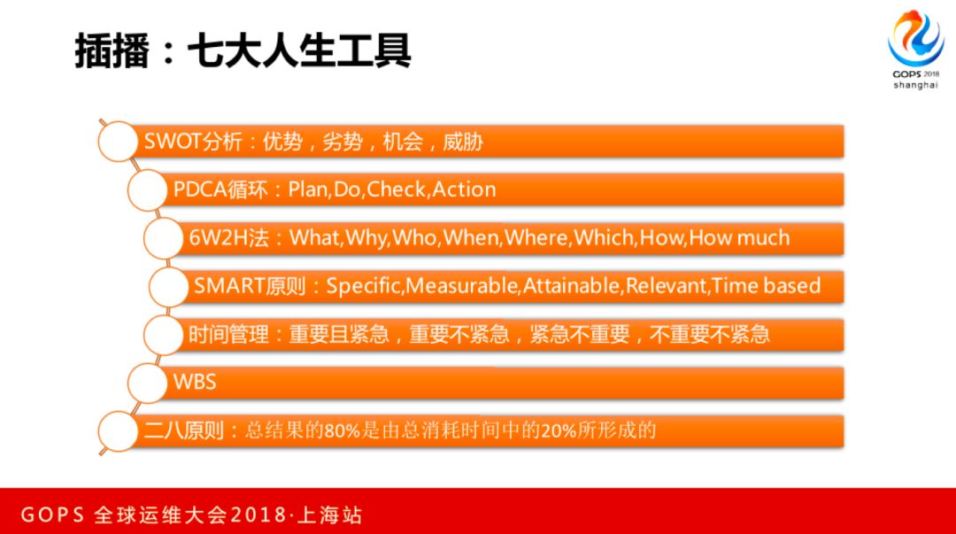 这一块插播一下七大人生工具,SWOT分析PDCA循环、6W2H法、SMART原则、时间管理、WBS、八二原则,比如说WBS我开始看起来也非常有道理,但是做的时候发现有好多细节上的东西,真正实践的时候,尤其做项目的时候怎么样分解,是按照时间线分解还是按照任务分解呢?关于各种人生方法有好多书大家有兴趣也可以研究一下。
