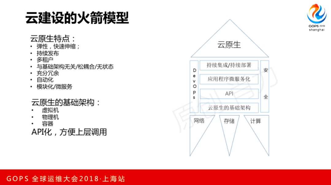 为什么要建设云?这里有个人的思考,也许不对,拿出来跟大家探讨。我总结的云建设的火箭模型,云建设的目标是要实现云原生,它有什么特点呢?弹性、持续发布、多租户、与基础架构无关、无状态、充分冗余、自动化、模块化、微服务。因为要把业务拆微服务实现云原生,首先要实现基础架构云原生,要实现虚拟机、物理机、容器的管理API化,方便上层调用。