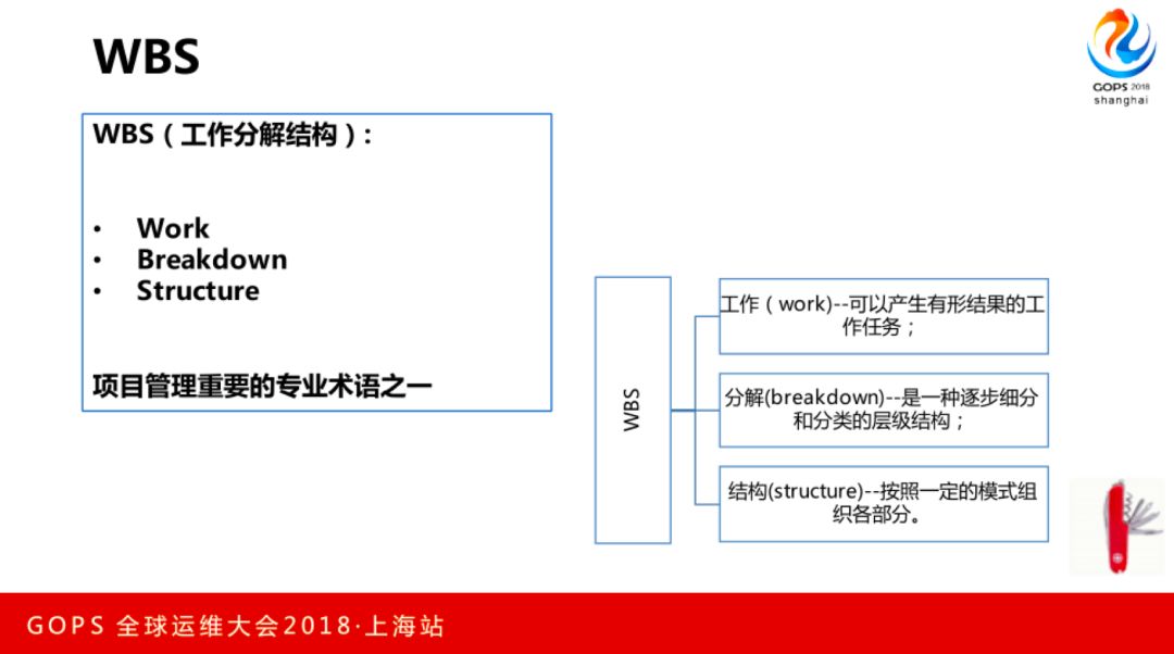 这就是我们人员组织方面的经验。然后就进入项目立项阶段,我们会指定Owner,然后制定实施方案,主要就是WBS的形式,WBS就是三个字母的缩写,Work、Breakdown、Structure,它是按照一定的结构模式去组织的。