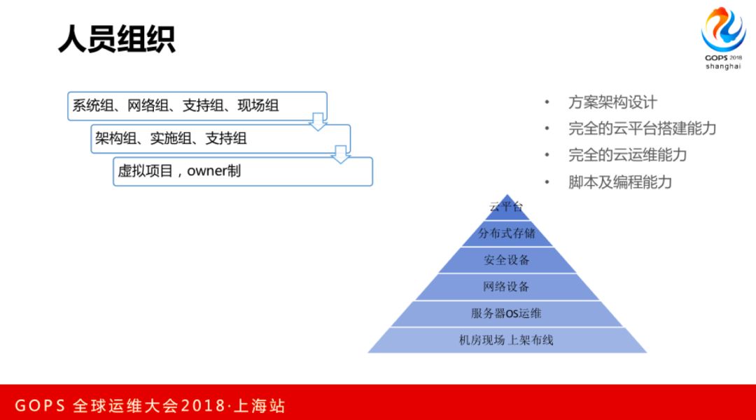 架构组要有方案的能力和云平台的搭建能力,还要完整的云运维能力,还要脚本以及编程能力。每碰到一个新项目来的时候我们生成虚拟项目组,这个项目会有唯一的运维内部的owner,从项目开始到项目结束,他是唯一的责任人,也包括跟客户和公司技术人员对接。这个项目出了问题这个owner必须要负责,觉得容量不够了就要申请资源,客户有需求也会跟客户约谈,他知道这是责任是他的,他也跑不掉。