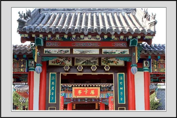 ►历下亭上书杜甫名句:“海右此亭古,济南名士多”。图片来源:南山老农zxp新浪博客