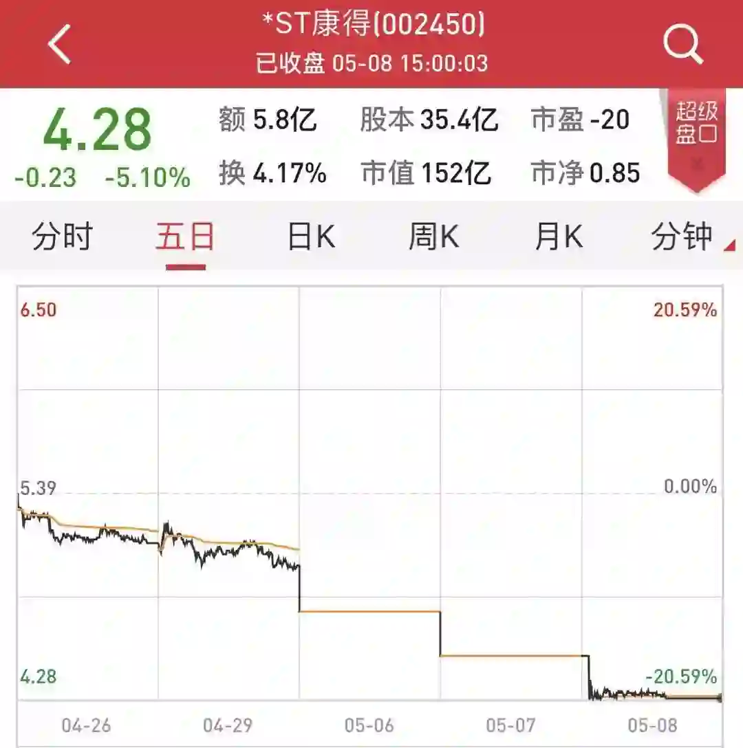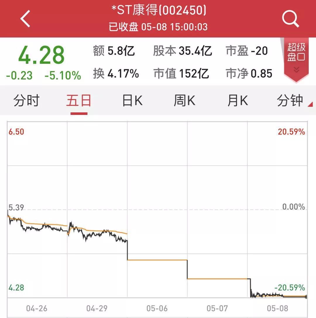 5月8日,康得新股价在最近6个交易日内收获第5个跌停,报收4.28元。