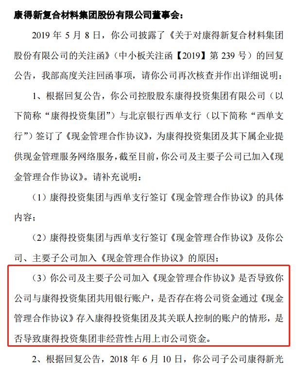 该问题也已引起交易所关注。5月8日晚间,交易所要求康得新说明控股股东康得投资集团与西单支行签订《现金管理合作协议》的具体内容,是否存在将公司资金存入康得投资集团账户的情形。