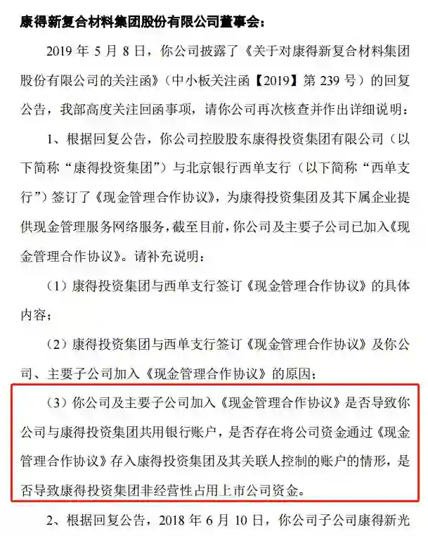 深交所于5月8日又发了关注函,要求*ST康得进一步说明西单支行与康得投资集团签署《现金管理合作协议》的具体内容,以及上述协议是否导致公司与康得投资集团共用银行账户,是否存在将公司资金存入康得投资集团及其关联人控制的账户的情形,是否导致康得投资集团非经营性占用上市公司资金。