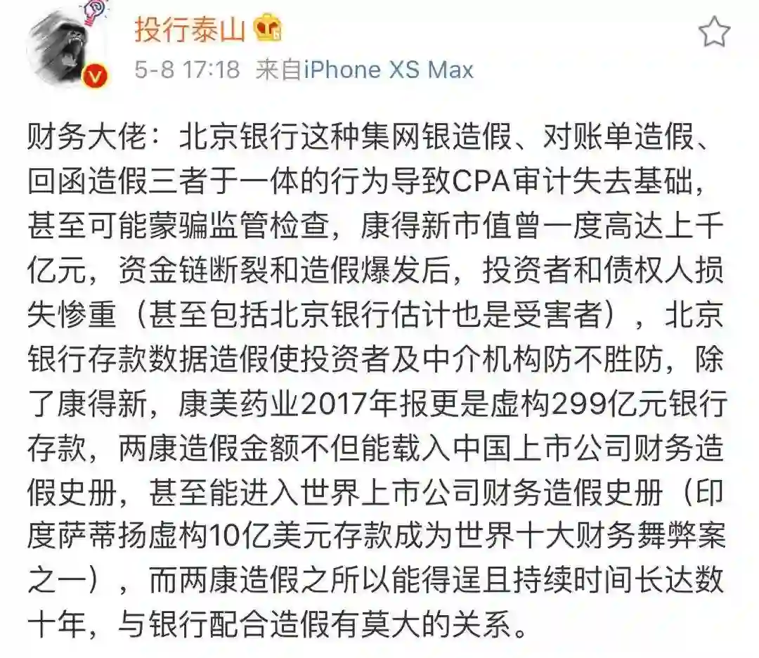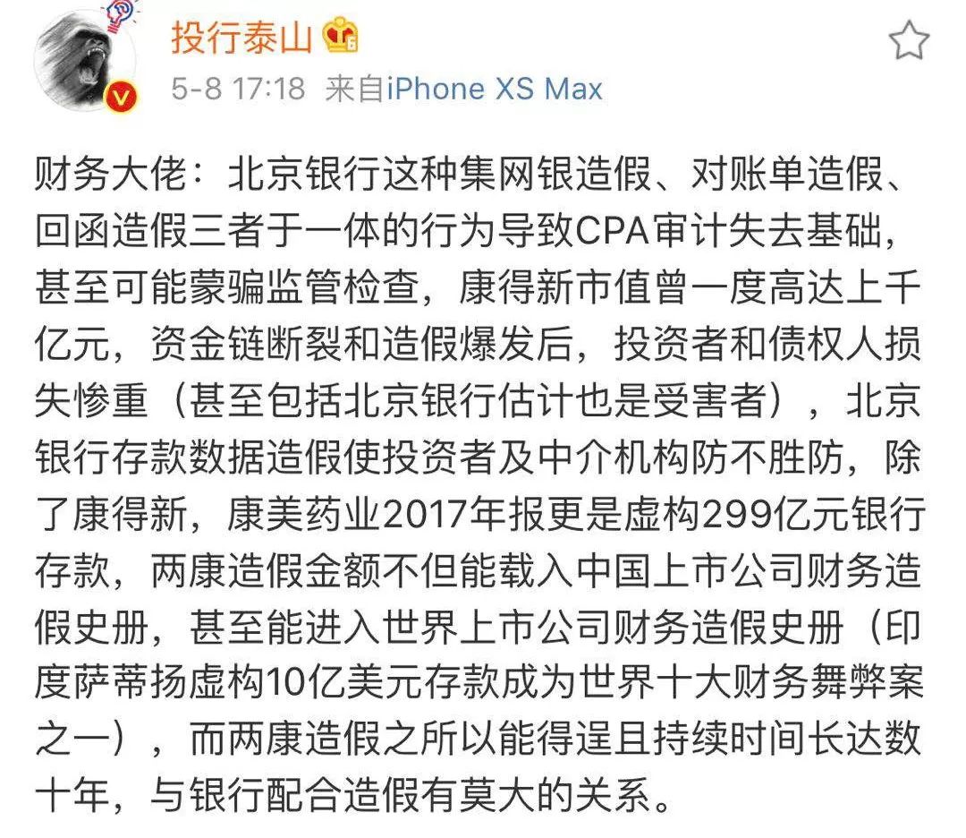 而微博@投行泰山则称:北京银行这种集网银造假、对账单造假、回函造假三者于一体的行为导致CPA审计失去基础,甚至可能蒙骗监管检查,康得新市值曾一度高达上千亿元,资金链断裂和造假爆发后,投资者和债权人损失惨重(甚至包括北京银行估计也是受害者),北京银行存款数据造假使投资者及中介机构防不胜防,