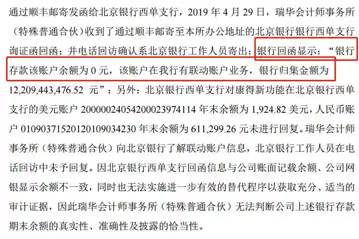 回复函显示,瑞华会计师事务所曾向北京银行西单支行核对该资金余额,银行回函显示:“银行存款该账户余额为0元,该账户在我行有联动账户业务,银行归集金额为122.1亿元。”