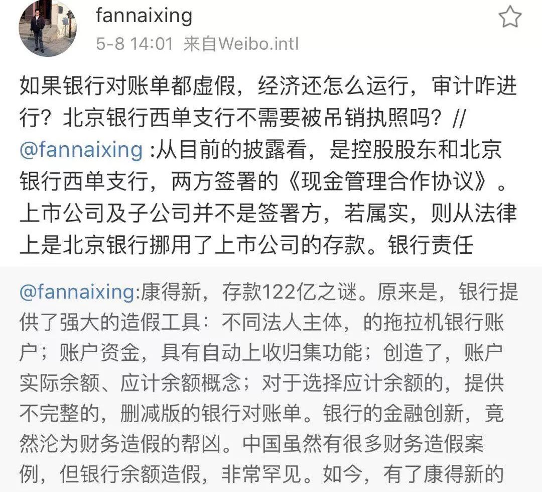 微博投资者@fannaixing发表评论称,康得新,存款122亿之谜。原来是,银行提供了强大的造假工具:不同法人主体,的拖拉机银行账户;账户资金,具有自动上收归集功能;创造了,账户实际余额、应计余额概念;对于选择应计余额的,提供不完整的,删减版的银行对账单。银行的金融创新,竟然沦为财务造假的帮凶。中国虽然有很多财务造假案例,但银行余额造假,非常罕见。如果银行对账单都虚假,经济还怎么运行,审计咋进行?北京银行西单支行不需要被吊销执照吗?