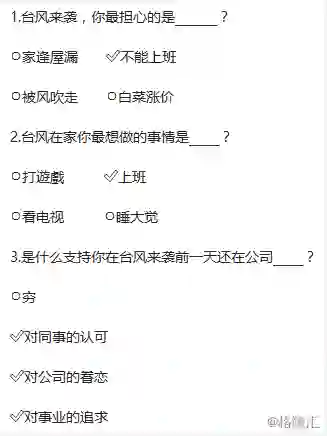 当然,需要装B的时候,姐姐也毫不含糊。公司在这样的台风天做了个问卷调查,姐姐是这么回答的: