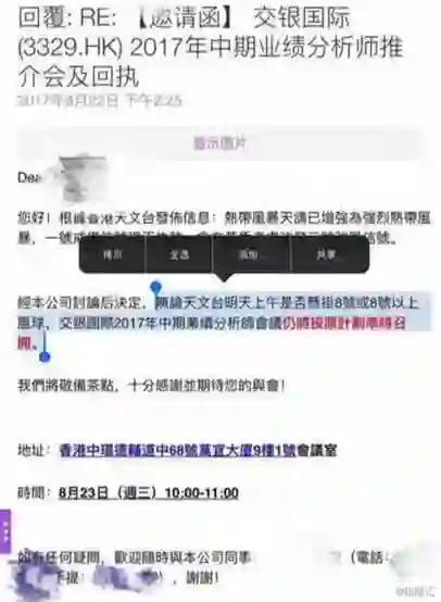 10号风球,还在开业绩会的,都是中国上市公司,参加业绩会的,都是中国的分析师。