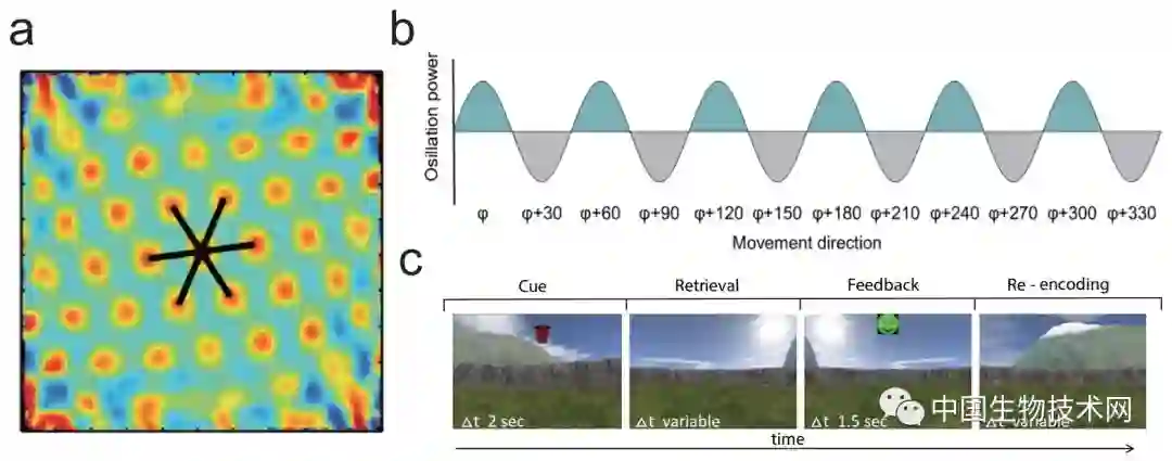 中国科学院心理研究所、北京师范大学和德国波鸿鲁尔大学的研究人员共招募了9名住院癫痫患者(分别来自清华大学附属玉泉医院、中国人民解放军总医院第一附属医院和德国Freiburg大学医学院),他们因药物治疗无效而需要接受手术治疗。术前医生会在患者脑内植入多根深部SEEG电极以精确评估癫痫灶的位置,电极植入位置完全根据治疗目的确定,与该研究无关。实验过程中受试者需要完成一个有关物体-位置关联记忆的虚拟现实任务(图1c),与此同时,研究者通过颅内电极直接记录大脑皮层的场电位信号,进而采用参数化线性回归的方法计算虚拟移动方向与内嗅皮层不同频率的信号强度之间的关系。前人研究提示,当网格细胞成功编码空间位置后,神经元发放会形成 6个间隔60度的主轴方向(图1a黑线):当被试沿着主轴方向运动时,网格细胞放电更剧烈,而沿着非主轴方向运动时,网格细胞放电相对微弱。研究假设神经振荡信号的振幅受到运动方向的调制:振幅与运动方向之间存在6周期的旋转对称性(图1b)。