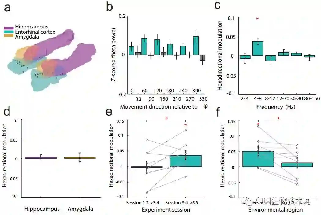 研究者首先研究了内嗅皮层的θ振荡(图2a黑点即为位于内嗅皮层的电极触点)是否携带网格细胞信号。如图2b所示,把θ振荡的振幅根据被试的运动方向分成12份后,呈现出明显的六周期模式,并且高低错落之间刚好是60度间隔,证明了人类内嗅皮层的θ振荡携带网格细胞信号。为了进一步研究六周期模式是否只存在于θ频段,研究者提取δ频段(2-4hz)、α频段(8-12hz)、β频段(12-30hz)、低频γ频段(30-80hz)以及高频γ频段(80-150hz)信号,并加以分析。然而研究者发现,这些频段的振幅均没有六周期模式出现,调制强度均不显著(图2c)。这些结果表明,只有θ振荡能够携带网格信号。网格信号是否是内嗅皮层独有的呢?研究者用相同的方法研究了与内嗅皮层相邻的海马和杏仁核,均没有发现六周期调制模式(图2d)。