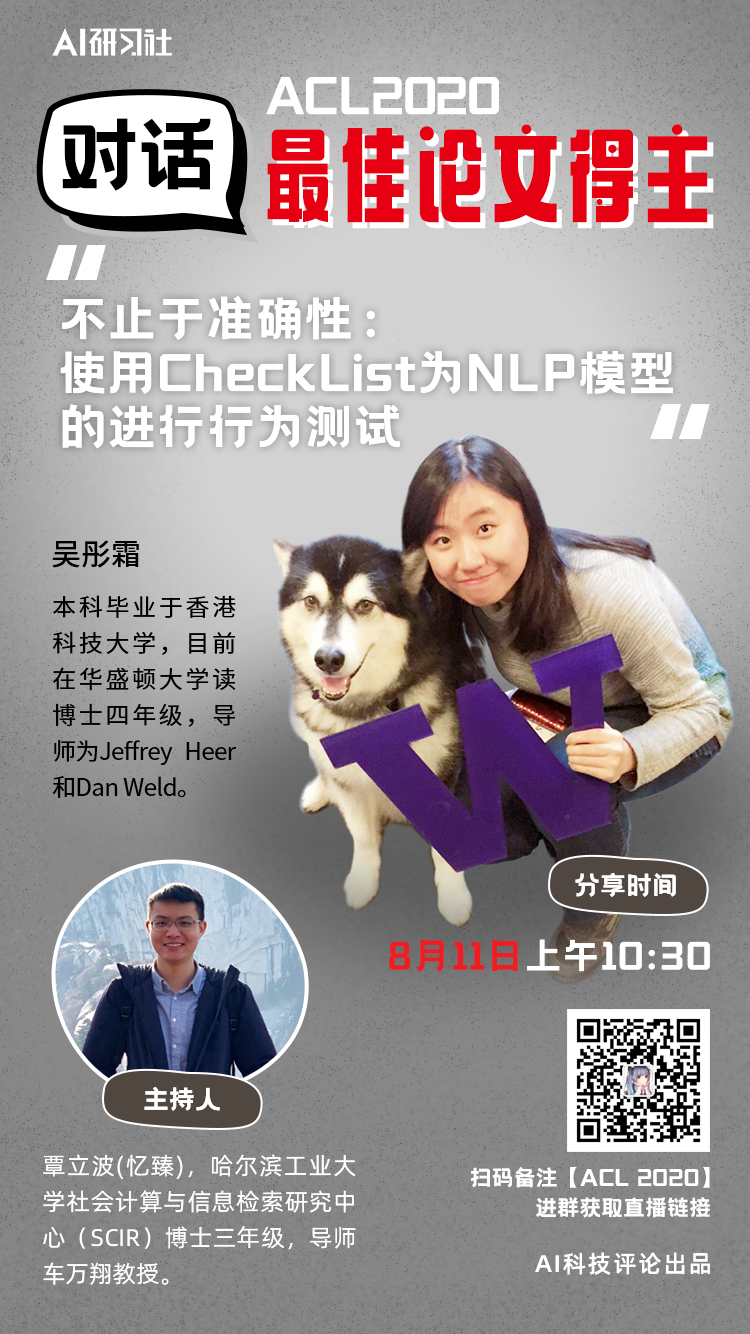 2020年8月11日上午10:30,在AI 科技评论重磅推出的ACL 2020最佳论文直播中,学霸小姐姐吴彤霜将亲自为大家带来详细的论文解读。