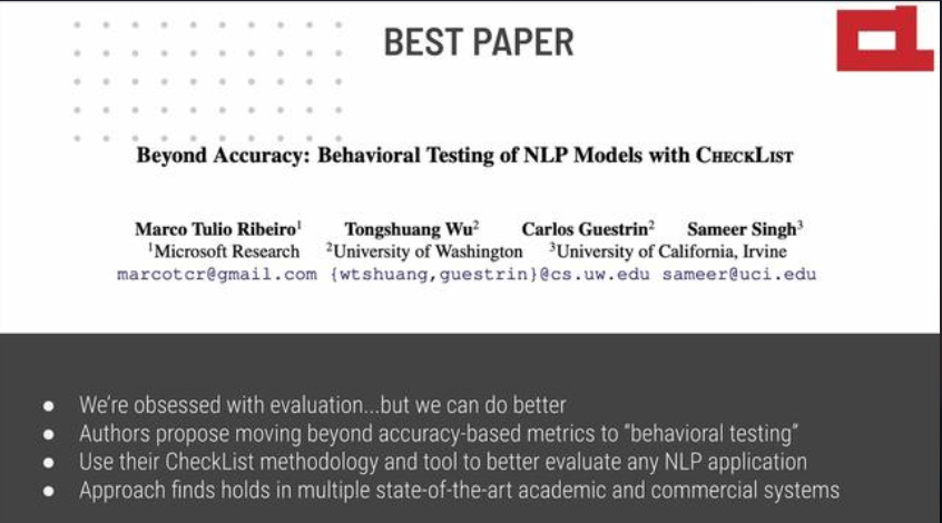 在今年的ACL 2020上一举拿下最佳论文奖的论文,便针对NLP 模型提出了一种全新的测试方法——CheckList,令人记忆犹新。