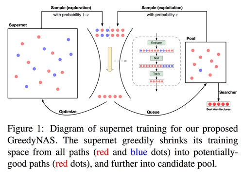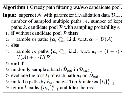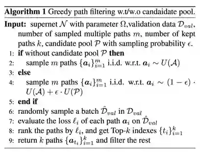 在前面提到的路径滤波中,我们通过评估可以区分出较好的结构,为了进一步提升训练效率,受蒙特卡洛树搜索(Monte Carlo tree search)[4] 和 deep Q-learning[5] 中常用的exploration and exploitation策略启发,我们提出使用一个路径候选池用于存放训练过程中评估过的“好”结构,并进行重复利用。具体而言,候选池可以看作是一个固定大小的有序队列,其只会存储所有评估过结构中得分前n(候选池大小) 的结构。