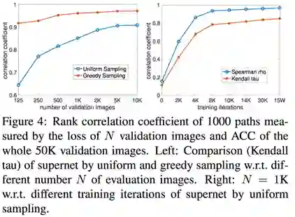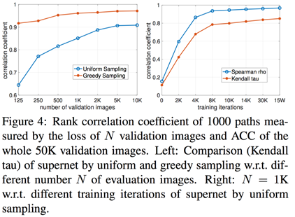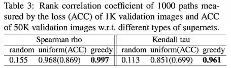 我们对随机初始化、uniformsampling、greedy方法训练得到的supernet下的小验证集指标与完整验证集ACC相关性进行了评估,如 Table 3 所示。可见在小验证集上使用loss相比ACC会得到更高的相关性,我们的贪心方法训练出的supernet有着更好的相关性。