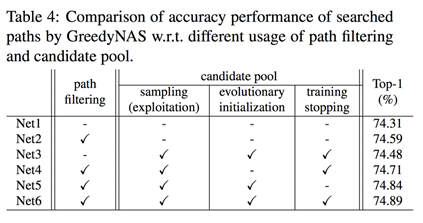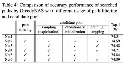 我们在MobileNetV2的search space下评估了多路径贪心采样及候选池的效果,如 Table 4 所示。