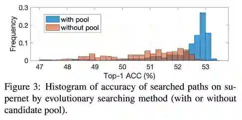 如 Figure 3 所示,我们在同一个训练好的supernet上使用了随机初始化与候选池初始化两种方式进行搜索,使用候选池初始化搜索到的结构的准确率平均会比随机初始化要高。