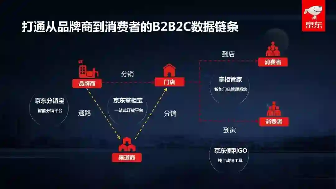 在供应端,京东新通路旗下推出京东分销宝和京东掌柜宝,前者帮助品牌商实现分销价格的透明可控管理;后者是为门店打造的一站式订货平台,帮助品牌商更快地将主流商品、推广商品卖进到门店。而通过全渠道卖货能力的提升,京东新通路也通过基于到店场景的“掌柜管家”和基于“到家”场景的“京东便利GO”小程序实现在消费者端的动销。