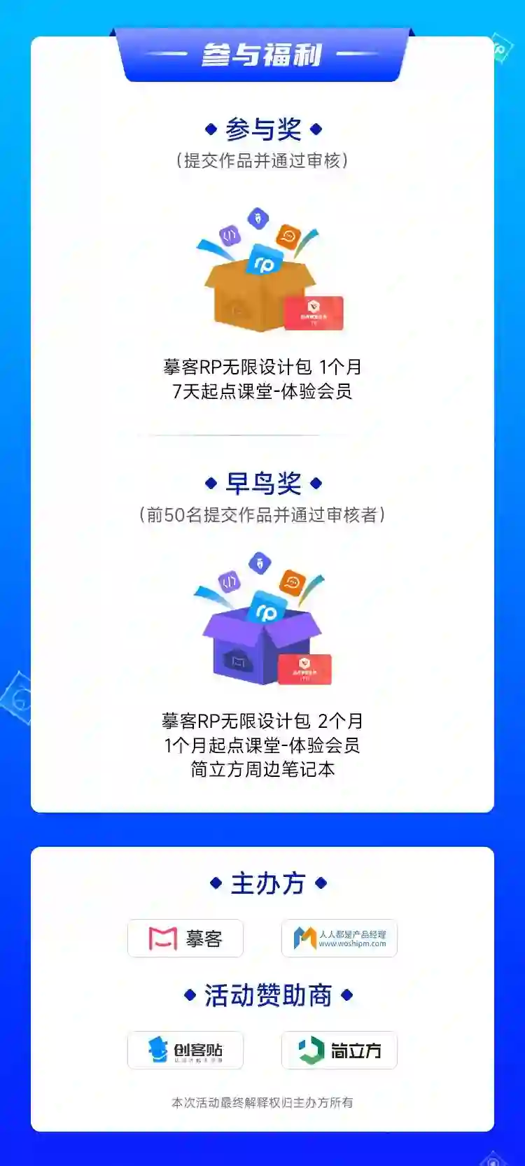 本次大赛所有作品的著作权依然归作者所有,但摹客和人人都是产品经理拥有该作品的使用权。
