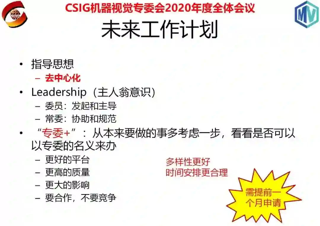 接下来,林主任介绍了下个年度的工作思路,他重申了专委工作“去中心化”的指导思想和委员活动“专委+”的具体做法,将委员时间作为最宝贵的资源,鼓励委员自发举办活动,专委会为委员提供更好的服务平台,资深委员和常务委员予以支持和协助,以扩大活动影响力为共同目标。他进一步介绍了学会对会议活动的要求和规范,提醒委员提前一个月提交活动申请。回顾这两年专委会的工作,这个指导思想对举办活动带来了更好的灵活性和多样性,对学术交流、产学研结合和成果宣传起到了良好的促进作用。