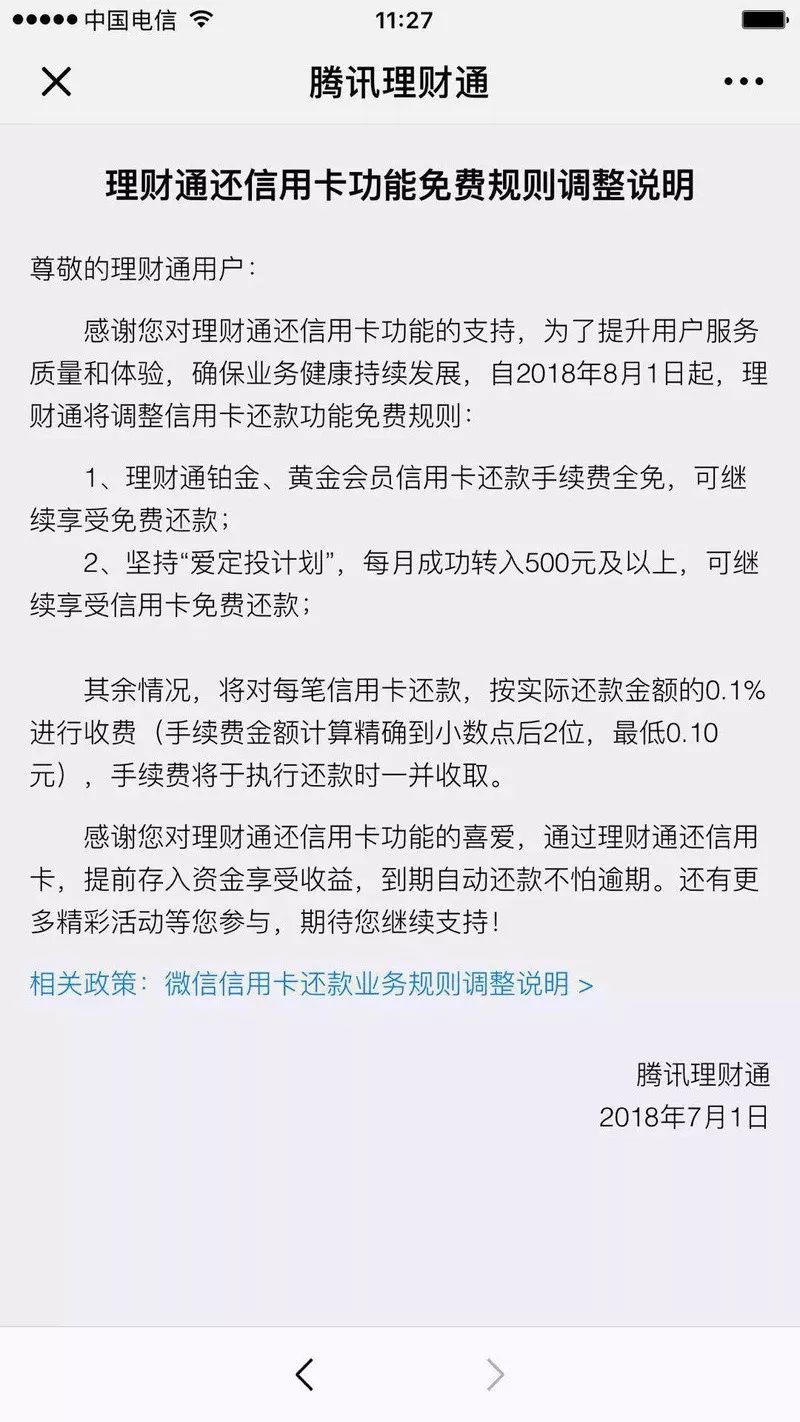36氪讯,腾讯理财通公告称,自2018年8月1日起,仅有理财通铂金、黄金会员的信用卡还款手续费继续享受全免政策,“爱定投计划”固定转入500元以上的用户也可以继续享受免费还款服务,除此之外,所有理财通用户的每笔信用卡还款都将被收取0.1%的费用,最低一毛钱。