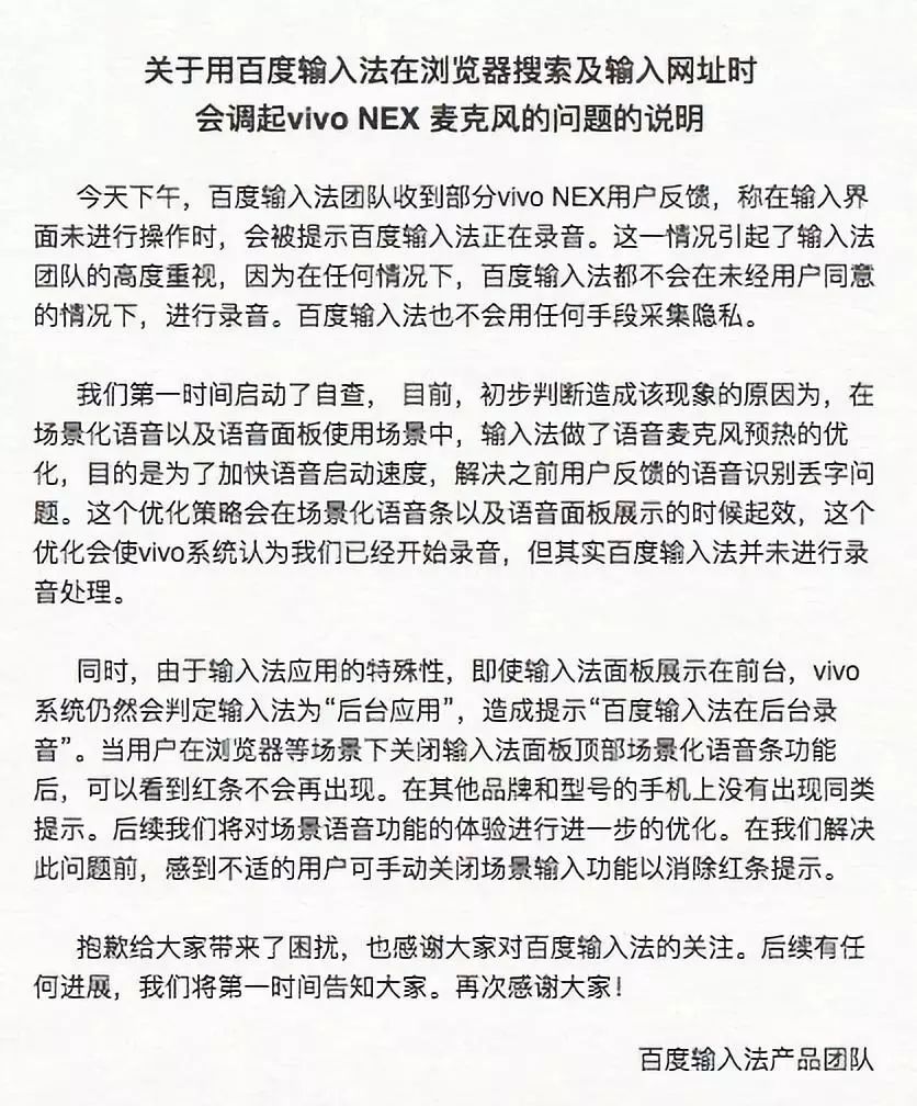 36氪讯,有微博用户爆料,用户在vivo NEX上使用百度输入法在打开手机自带的浏览器进行搜索的时候,在无任何操作的情况下,手机顶部显示“百度输入法正在录音”,并且会提示用户是否要禁止它。百度输入法官方微博回应称,只需要关闭智能场景语音功能后就可以消除该问题。