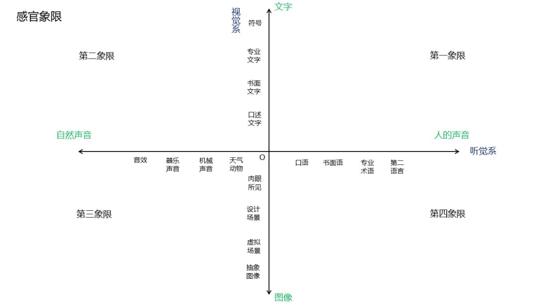 那么,我们以听觉系为X轴、视觉系为Y轴,建立二维直角坐标系。听觉系的两端为人的声音(以语言为主)、自然声音;视觉系的两端则是文字和图像。