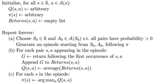 一个采用exploring starts的Monte Carlo control算法,如下图所示,称为Monte Carlo ES。而对于所有状态都采用soft policy的版本,这里不再讨论。