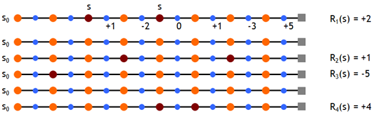 要注意的是,我们仅将蒙特卡罗方法定义在episode task上,所谓的episode task就是指不管采取哪种策略π,都会在有限时间内到达终止状态并获得回报的任务。比如玩棋类游戏,在有限步数以后总能达到输赢或者平局的结果并获得相应回报。