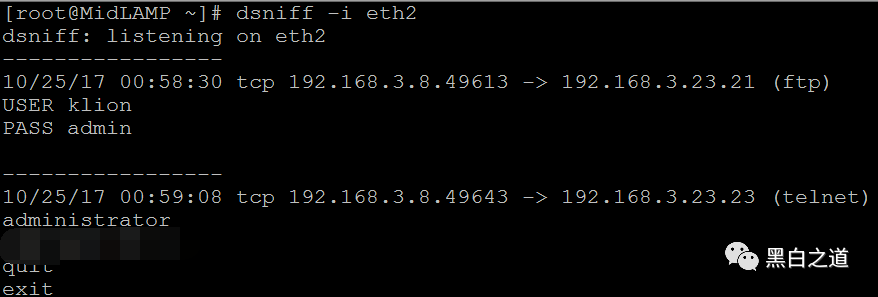 centos6.8 x86_64 ip: 192.168.3.4 eth2 mac: 00:0C:29:C4:A0:95 嗅探者的机器 dsniff