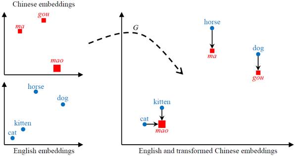 本文的方法是基于词向量的,也就是说,首先利用两种语言的单语语料将它们的词汇表示成向量的形式,由此两种语言的词汇将分布在两个不同的向量空间中。