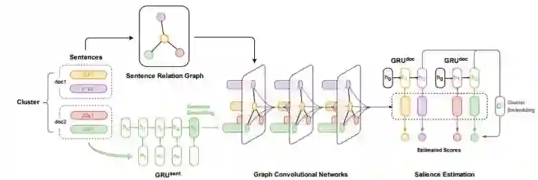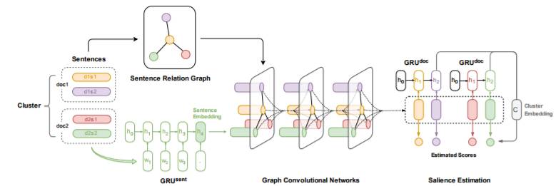 对于一个包含多个文档的集合。设计两个不同层次的GRU模型,句子级别和文档级别。在句子级别模型中通过GRU生成不同文档中的句子的向量表示(其中句子的向量表示通过GRU在该句子的最后一个隐含状态表示)。同时,构建文档集合中句子之间的连接关系,文中定义了三种确定句子之间连接关系的方法ADG、PDG以及tf-idf,将GRU生成的句子向量表示作为该句子节点的特征,输入图模型GCN中,经过三层GCN后得到该句子节点的新的状态表示。在文档级别的GRU模型中,通过输入句子序列生成单个文档的向量表示,多个文档集合的通过单个文档的向量表示取平均求得。最后,通过综合多文档向量表示和经过GCN后每个句子的向量表示,可以得到得到最终的loss,表示为