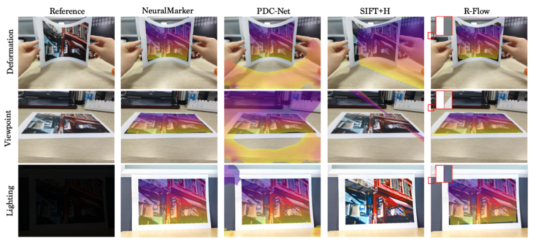 如下图和视频所示,NeuralMarker 对三个扰动因素都有较强的鲁棒性。PDC-Net 和 RANSAC-Flow 是稠密对应关系估计方法,容易在不相关区域估计出 Correspondence。SIFT+H 是一种传统方法,对视角变化和光照变化都不鲁邦,同时无法处理形变因为单应性矩阵本质上假设估计的对应关系是一个平面。