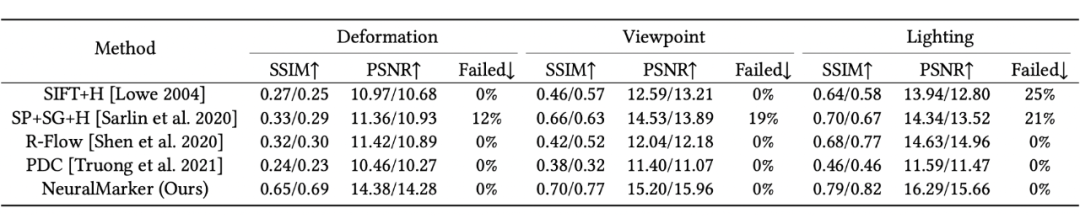 本文使用 SSIM 与 PSNR 的均值/中位数 单应性矩阵估计要求至少有四个对应点,否则无法估计出该矩阵,因此 SIFT+H 与 SP+SG+H 在太具挑战的条件下无法出解(Failed)。SIFT 特征在形变和视角变化时比 SP+SG 更鲁棒,但是对光照变化更脆弱。RANSAC-Flow 与 PDC-Net 总能出解,但是对这几个扰动因素仍然比较脆弱。NeuralMarker 在所有方法中都展现出了卓越的精度和鲁棒性,尽管 RANSAC-Flow 对光照变化也比较鲁棒但是仍然比 NeuralMarker 要差。