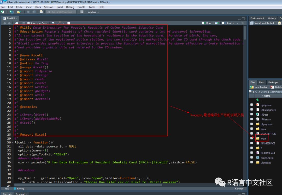 生成的文档在\man目录下,此例中生成了Ricetl.Rd,......文件。关于roxygen2的使用可以参考详细的教程。 最终结果如下: