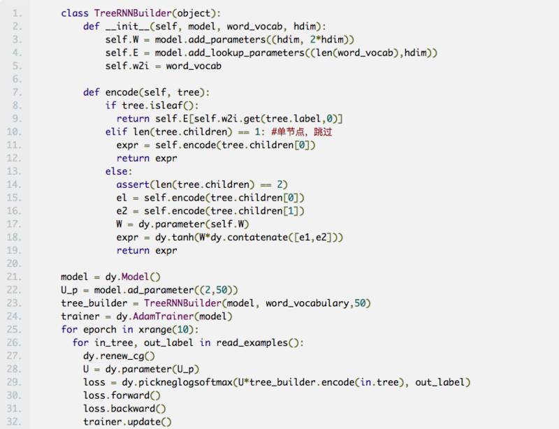 向模型里增加必要的参数(Parameters)和查找表参数(LookupParameters)。创建一个训练器(Trainer)对象,并使之与模型(Model)相关联。