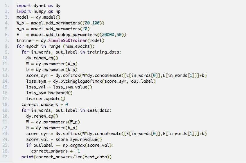 与像 TensorFlow 这样的静态声明库对比可以发现,DyNet 中创建一个图的步骤落在每一个循环里。这有利于用户为每个实例(instance)灵活地创建新的图结构,并使用他们掌握的编程语言中的流控句法(flow control syntax,比如迭代(iteration))来做这些。
